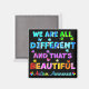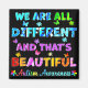 Citação inspiradora de "Somos Todos DIFERENTES E Isso é LINDO" com quebra-cabeça autistas únicos, e borboletas coloridas voando em segundo plano para apoiar e defender a consciência do autismo.