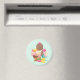Um ímã ilustrado com o desenho de um sundae de sorvete de 3 colher com bordos coloridos. Um cone de sorvete com colheres de chocolate, morango e baunilha. Uma tigela de sorvete neopolita com uma cereja em cima. Morangos e uma fruta de abacaxi sentam ao lado das tigelas. Sumério e doce.