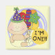 Um bebê adorável em um chapéu de festa, balões de aniversário e texto que diz "Sou UM" em roupas de aniversário, cartas, sacos de tote, t-shirts, e convites de aniversário correspondentes também!