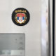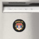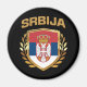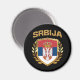 A bandeira nacional da Sérvia é infundida numa forma falsa de escudo dourado que, por si só, repousa sobre folhas falsas de ouro, o nome do país é acrescentado acima da imagem.