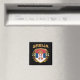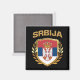 A bandeira nacional da Sérvia é infundida numa forma falsa de escudo dourado que, por si só, repousa sobre folhas falsas de ouro, o nome do país é acrescentado acima da imagem.
