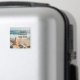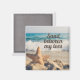 Magneta com a foto de uma estrela do mar em uma praia arenosa no oceano. Texto diz, "Areia entre os dedos dos pés."