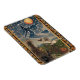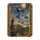 Íman de Halloween mostrando uma bruxa voando através de um céu noturno estrelado sobre campos com abóboras, um gato preto, e uma coruja. A bruxa está esboçada em estrelas. Isto é de um design de Halloween de 1913.