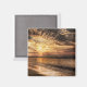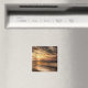 Foto impressionante da paisagem do nascer do sol sobre uma praia com um dramático céu nublado em contraste com a água calma.
