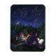 A arte Starry Night de Traci Van Wagoner impressão, posters, acessórios e presentes mostra nossa pintura original de duas crianças e seu grande e negro cão acampando sob as estrelas lendo um livro fantástico ao redor de um fogo no acampamento sobre cavaleiros e dragões. A magia da história está subindo no céu estrelado para mostrar um cavaleiro e um dragão numa dança eterna noturna de estrelas. Aproveite um acampamento noturno de verão nas montanhas.