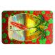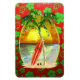 Feliz Feriados das praias arenosas quentes da sua praia tropical favorita. Palmeira decorada com Enfeites de natal e luzes, com um prato de superfície retrorreflector inclinado contra a árvore de Natal em frente a um pôr do sol sobre o oceano. Cor vermelha e verde das tartarugas marinhas havaianas Honu e flores de hibisco.