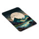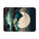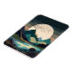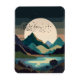 Uma paisagem abstrato de uma enorme superlua em uma cena de lago montanhês com um bando de pássaros em texturas ousadas e tons escuros de marrom, bege, bronzeado, azul, ciano e preto.