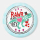 Um ímã com a imagem de um t-rex verde vestindo um chapéu preto com corações ao redor. O texto diz que Rawr quer dizer que te amo em t-rex.