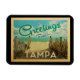 Esta design do Cartaz de Tampa apresenta uma praia arenosa com uma bela água turquesa oceânica e acima do mar, um céu azul com nuvens brancas onduladas. No estilo viagens vintage.