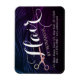 Salão de Cabelo / Cabeleireiro / Cabelereira / Salão de Beleza / Maquiadores / Planejadores de Tesoura / Planejadores de Eventos / Consultores / Proprietários de Lojas / Modelos de Ímãs Personalizados para Fashionistas - Tesoura de Faux Rose Moderno em Fundo de Padrão de Cabelo Preto e Roxo Elegante.