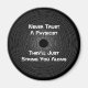 Uma imã de geladeira de slogan. Nunca Confie num Físico, Eles vão te enforcar - impressos em branco sobre um buraco negro feito de corda. Perfeito para físico, estudante de física ou professor.