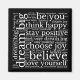 Frases inspiradoras com um bom fator a ser exibido na sua geladeira com este padrão WordArt de citações encorajadoras, Acredite, Escolha alegria, ame-se, Pense feliz, Sonhe grande, Mantenha-se positivo e Seja você, em tipografia branca sobre fundo preto.