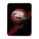 Um objeto esférico - que parece quase um planeta ou uma esfera energética - é colocado contra um fundo escuro, ao estilo cósmico. A esfera é predominantemente vermelha profunda, com espirais dinâmicas de luz branca brilhante e dourada pálida cercando sua superfície em padrões complexos e caóticos. Essas trilhas de luz dão a ilusão do movimento, como se a energia estivesse fluindo e girando constantemente dentro e em volta da esfera. Atrás da esfera, bandas diagonais de luz vermelha cortam através da escuridão, acrescentando profundidade e drama. Ao redor da esfera, há poços de luz esmaecidos e saborosos - quase como filamentos de eletricidade ou cósmicos - flutuando livremente, sugerindo que a esfera está irradiando energia ou suspensa em um vazio surreal, parecido com o espaço.