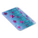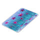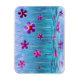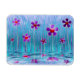 Um desenho digital de lindas flores roxas estilizadas com centros vermelhos brilhantes. Estão a espreitar-vos com instabilidade a partir da erva alta ao lado de uma piscina de água ripada.