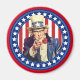 Símbolo dos Estados Unidos, Orgulho Nacional e chamada à ação, esta imagem do Tio Sam inclui estrelas redondas e listras de fundo em vermelho, branco e azul.