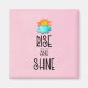 Um ímã com um design tipográfico fofo. Uma nuvem fofa e um sol laranja sobre um fundo rosa. Rise and Shine escrito em uma fonte de tendência legal.