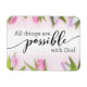 Design de tipografia com legenda em letras brancas, "Todas as coisas são possíveis com Deus." Design é a dentro central de borda colorida de fotografia de tulipas. O verso bíblia é de Matthew 19:26.