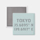 O ímã quadrado moderno e urbano apresenta as coordenadas latitude e longitude de Tóquio, Japão no texto da cinza sobre fundo azul