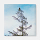 Uma fotografia de uma águia-calva americana tocando uma árvore de pinheiro alto. Um céu azul com nuvens negras está no fundo. Vestígios de luz solar e neve podem ser encontrados na árvore e são galhos. Imagem Copyright 2017 Kimberly J Tilley.