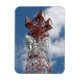 Uma torre de telecomunicações de micro-ondas vermelha e branca para o serviço de retransmissão de rádio de micro-ondas é apoiada por um céu azul e nuvens brancas inchadas no campo. Uma vez usadas pelas companhias telefônicas para repassar chamadas de longa distância, essas torres agora são úteis no suporte a novas tecnologias de telecom, como telefones celulares e provedores de serviços de Internet sem fio.