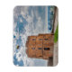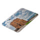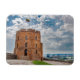 Pintura do monumento da torre Gediminas em Vilnius, Lituânia. Pequena torre de tijolos de laranja com bandeira lituana na colina contra a bela vista no centro histórico da cidade de Vilnius.