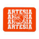 Artesia Bulldog Tradition Magnet, com íman laranja com letra de Artesia branca e contorno de Bulldog branco sobreposto no meio. (Sempre que este Bulldog é visto sem os direitos autorais dos Designs do Skyrider, ele é roubado e só está disponível legalmente nesta loja)