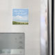 As ondas brancas suaves subem contra esta praia tranquila, limitada por dunas de areia com grama-verde acenando na brisa. O céu azul está cheio de nuvens brancas fluffy.