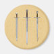 Uma espada do período Norman com uma pommel de castanha-do-Brasil, uma "espada Excelente" ou "Espada de Guerra", de longa bexiga, do século 13 ou 14, e uma espada tortuosa aguçada na Idade Média Atrasada aparecem lado a lado nesta ilustração original de Richard H. Fay.