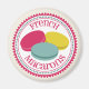 Um ímã com ilustração de três macarões franceses (rosa, azul e amarelo) dentro, um círculo decorativo rosa e azul com texto rosa.