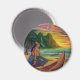 Um adesivo de cores ricas com uma cena das ilhas trópicas. Montanhas, litoral, barcos de madeira e uma jovem moça na saia de grama
