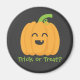Um desenho fofo de uma abóbora laranja com uma entalhe que mostra uma expressão sorridente a ser usada como uma lanterna Jack O. O sorriso com uma exibição de dente faz você querer sorrir também. O texto diz "Trick or Tratat?" Design para o Halloween!