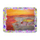 mostra um pescador de moscas amarrando uma mosca com o pôr do sol e truta arco-íris perseguindo uma mosca de arte original também mergulha no fundo da pintura!