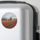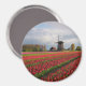 Imagem circular de uma paisagem primavera com um campo com tulipas vermelhas e outras flores e um moinho de vento durante o nascer do sol nos jardins de Keukenhof, Região de Bulb, Países Baixos.