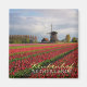 Fotografia de Souvenir de uma paisagem primavera com um campo com tulipas vermelhas e outras flores e um moinho durante o nascer do sol nos jardins de Keukenhof, Região de Bulb, Países Baixos, com o texto "Keukenhof, Países Baixos".