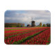 Imã fotográfico retangular com primavera paisagístico, com um campo com tulipas vermelhas e outras flores e um moinho durante o nascer do sol nos jardins de Keukenhof, Região de Bulb, Países Baixos.