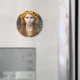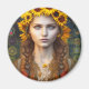 A imã de geladeira redonda apresenta um retrato incrivelmente bonito de uma jovem ucraniana com cabelos longos e trançados, coroa de girassol e fundo com padrão amuleto, criado com software de renderização AI. Slava Ucraniano!