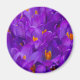 Uma fotografia natural adorável de um campo de crocos brilhantes florescentes, pétalas roxas vibrantes com centros laranja amarelo brilhante.