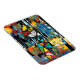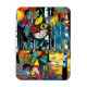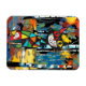 Um gato branco com aparência geométrica, de vidro manchado se encontra em uma floresta vibrante de pássaros. O fundo apresenta uma mistura colorida de folhas de outono e tons de azul e amarelo. Photoshop de arte digital