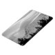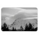 Foto em preto e branco do Monte Rainier. Há árvores no primeiro plano. Há nuvens lenticulares formando e preenchendo o céu ao redor no topo do vulcão adormecido. Imagem Copyright ©2023 Kimberly J Tilley. zazzle.com/store/developingnature
