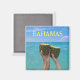 Esta imã de geladeira - Melhor nas Bahamas - tem uma foto tirada na Praia Cabbage da Ilha do Paraíso com duas mãos cada uma segurando um meio abacaxi cheio de um punho de rum. Os abacaxis são mantidos contra um mar azul e o céu azul. O texto é amarelo vivo.