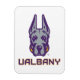 O logotipo do mascote da Universidade de Albany Great Dane apresenta uma representação estilizada da cabeça de Great Dane. O cão é ilustrado com linhas vivas e corajosas em roxo e cinzas, dando-lhe uma expressão feroz e confiante. Os ouvidos são altos, simbolizando o alerta e a força. Por baixo da cabeça de Great Dane está a palavra "UAlbany" escrita em letras ouros arrojadas e achatadas em roxo, reforçando a marca da universidade. Esta design representa as equipes esportivas da UAlbany, destacando poder, lealdade e determinação.
