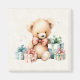 Magnet com uma ilustração fofinha com um ursinho de pelúcia estilo vitoriano. Vestindo um arco vermelho rico. Desenhado em um estilo vintage bonito e antigo. Presentes de Natal pastel vermelho e azul rodeados por este urso de coração quente.
