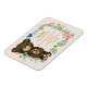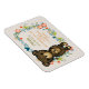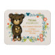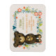 Um imã com os detalhes de nascimento do seu bebê. Projetado com uma ilustração fofinha de um ursinho marrom de desenho animado segurando uma margarida amarela. Cercada por uma coroa floral decorativa com flores, folhas, prigos e corações. Esquema de cor do outono.