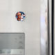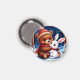 Ilustração de um ursinho de pelúcia alegre abraçando um coelho em uma noite de inverno nevada, cercado por decorações festivas de feriado e um trem de brinquedo colorido.