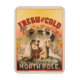 Anúncio venenoso de uma cena no Polo Norte onde ursos polares estão desfrutando canecas de cerveja ávida, com efeito trompe-l'oeil mostrando pessoas sobreaquecidas, com fãs e raios de sol, e um homem chegando a cena por uma gelada caneca fresca e fria de cerveja ávida oferecida a ele por um urso polar.