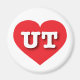Este ímã apresenta um coração vermelho vibrante contendo as letras maiúsculas, em negrito, branco, UT, a abreviação oficial de Utah, o estado da colmeia.