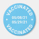 Botão de pino vacinado com datas personalizadas e ímã de texto. Texto personalizável, datas. Podem também ser eliminados. Azul claro e branco