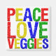 Peace Love Veggies shirts, roupa e presentes apresentados num design angustiado e colorido para mostrar a sua dedicação ao estilo de vida vegetariano. Faz um presente excelente para veganos e vegetarianos. Disponível em sacos de tote, canecas de café, botões, adesivos, ímanes e muito mais.