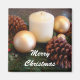 Uma vela elegante cercada por cones de pinho e ornamentos. Mude o ditado como desejado.