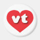 Este ímã apresenta um coração vermelho vibrante contendo as letras maiúsculas vt, brancas, arredondadas e em negrito, uma abreviação lúdica para Vermont, o estado verde da montanha.